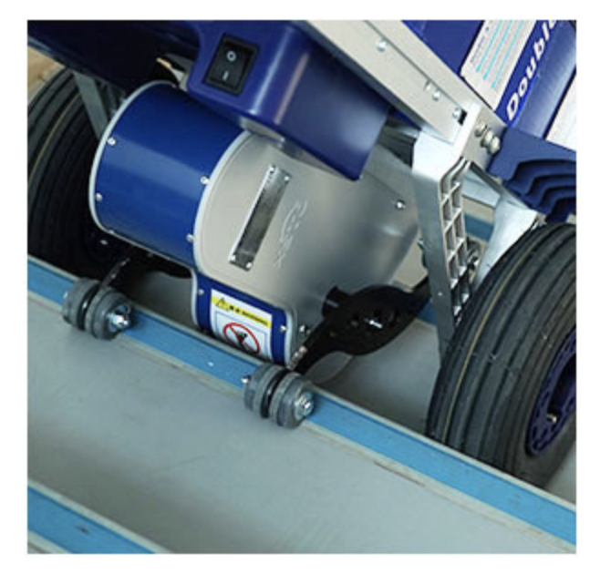 Má široká stabilní kola a opěrná kola jsou protiskluzová polyuretanová. Součástí elektrického rudlu je baterie, nabíječka a upínací popruh.